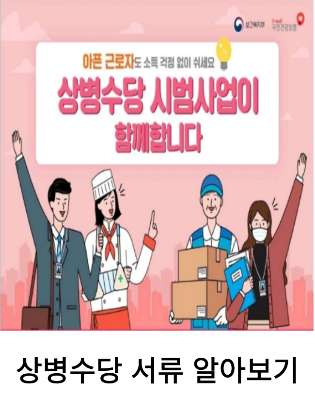 정부지원금을 신청하기 위해서는 여러가지 첨부서류들이 필요합니다. 상병수당을 시범운영하는 지역마닥 필요한 서류 다를수 있으니 서류 양식을 확인하시고 상병수당 신청 전 준비하시기바랍니다.